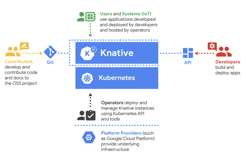 Knative implements many of the learnings from Google. The open source project already has contributions from companies like Pivotal, IBM, Red Hat and SAP and collaboration with open-source Function-as-a-Service framework communities like OpenWhisk, riff, and Kyma who either replatform on to Knative or consume one or more components from the Knative project.